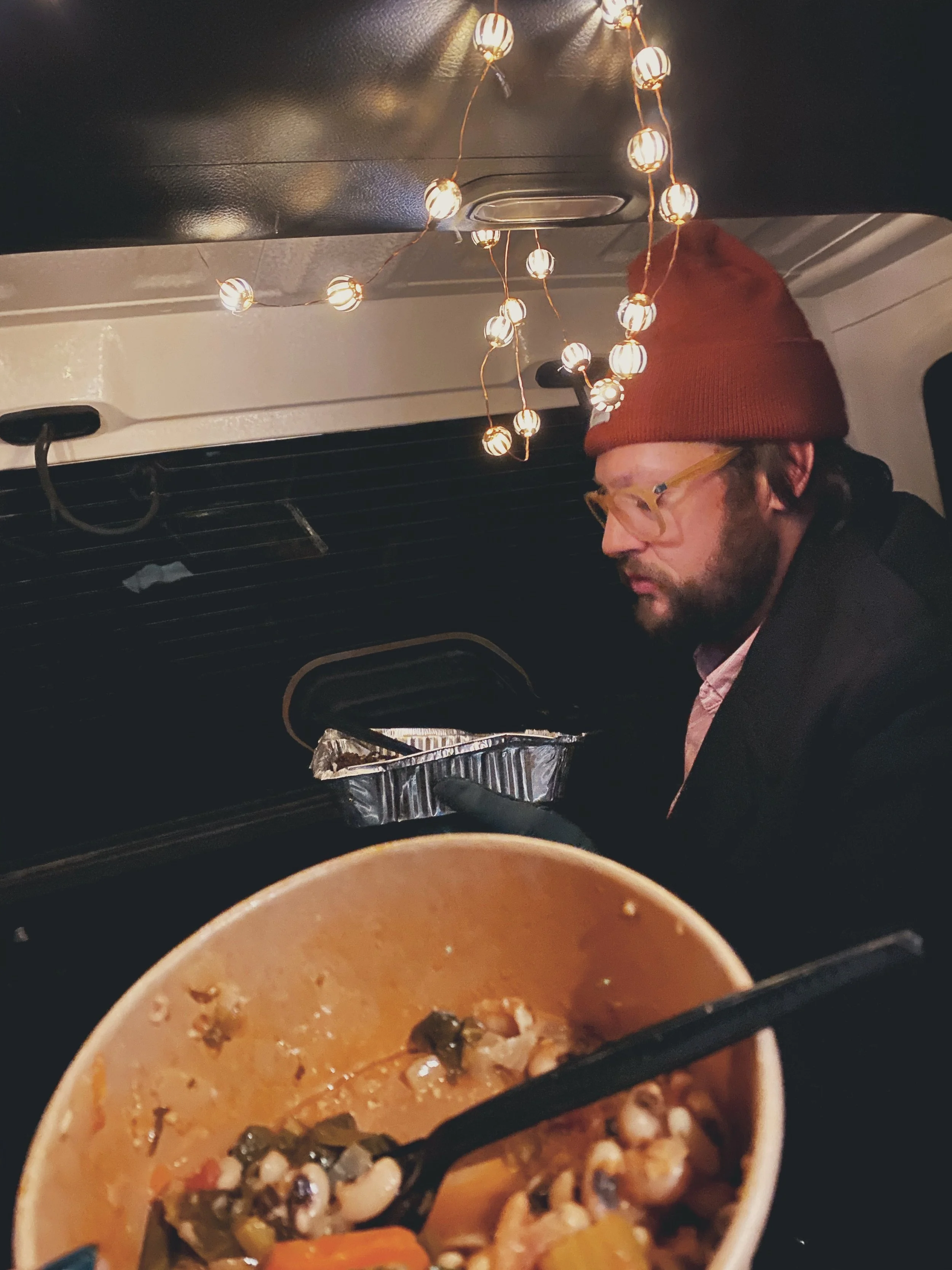 Black eyed peas, collard greens, cornbread and vegan chili from the cutest (now closed) restaurant Stellina kept us cozy and ushered in the typical new years wishes in the back of a Jeep Wrangler illuminated by LED christmas lights. We tried to watch the Marfa lights in the snowy tundra. (yeah.) But couldn’t see ANYTHING but our breath and headed back to the hotel to play the new resonator Jess got Tom and pass out around midnight.
